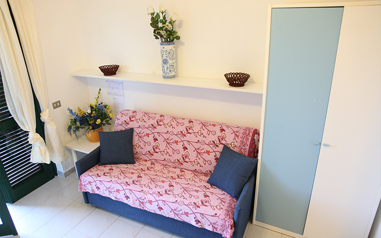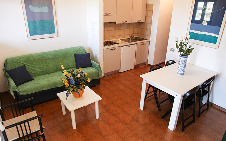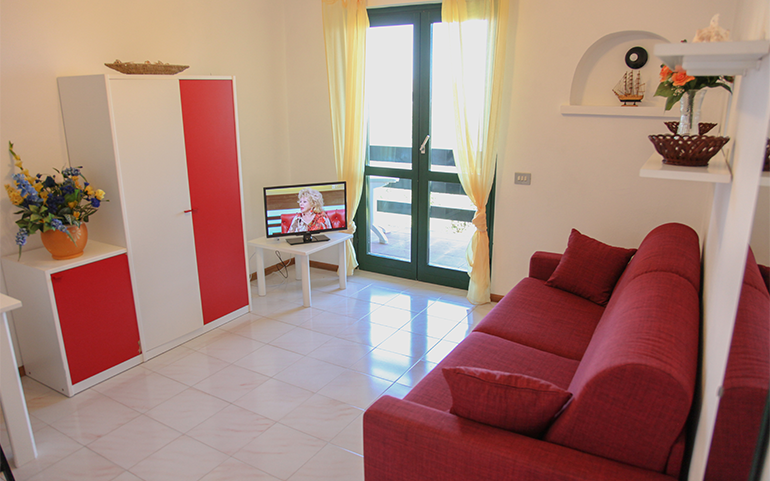 Appartamento dotato di soggiorno con angolo cottura e divano letto, tv, frigorifero e wifi gratis, bagno con doccia, bidet e finestra. Appartamento dotato di infissi in tutte le porte e finestre, di terrazza con tavolo e sedie esterne. Soggiorni prenotabili da domenica a domenica con minima permanenza 7 notti. Per prenotazioni superiori a 7 notti non si garantisce l'assegnazione nello stesso appartamento.
