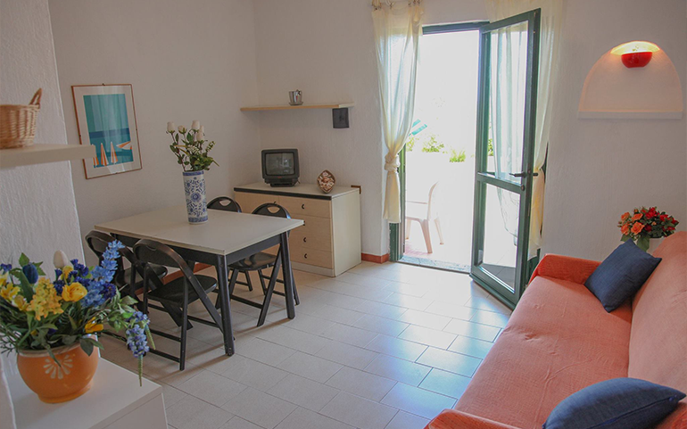 Appartamento dotato di soggiorno con angolo cottura e divano letto, tv, frigorifero e wifi gratis. Camera con letto matrimoniale. Bagno con doccia, bidet e finestra. Appartamento dotato di infissi in tutte le porte e finestre, terrazza o patio con tavolo e sedie esterne. Soggiorni prenotabili da sabato a sabato ( piano terra ) o da domenica a domenica ( primo piano) con minima permanenza 7 notti. Per prenotazioni superiori a 7 notti non si garantisce l'assegnazione nello stesso appartamento.